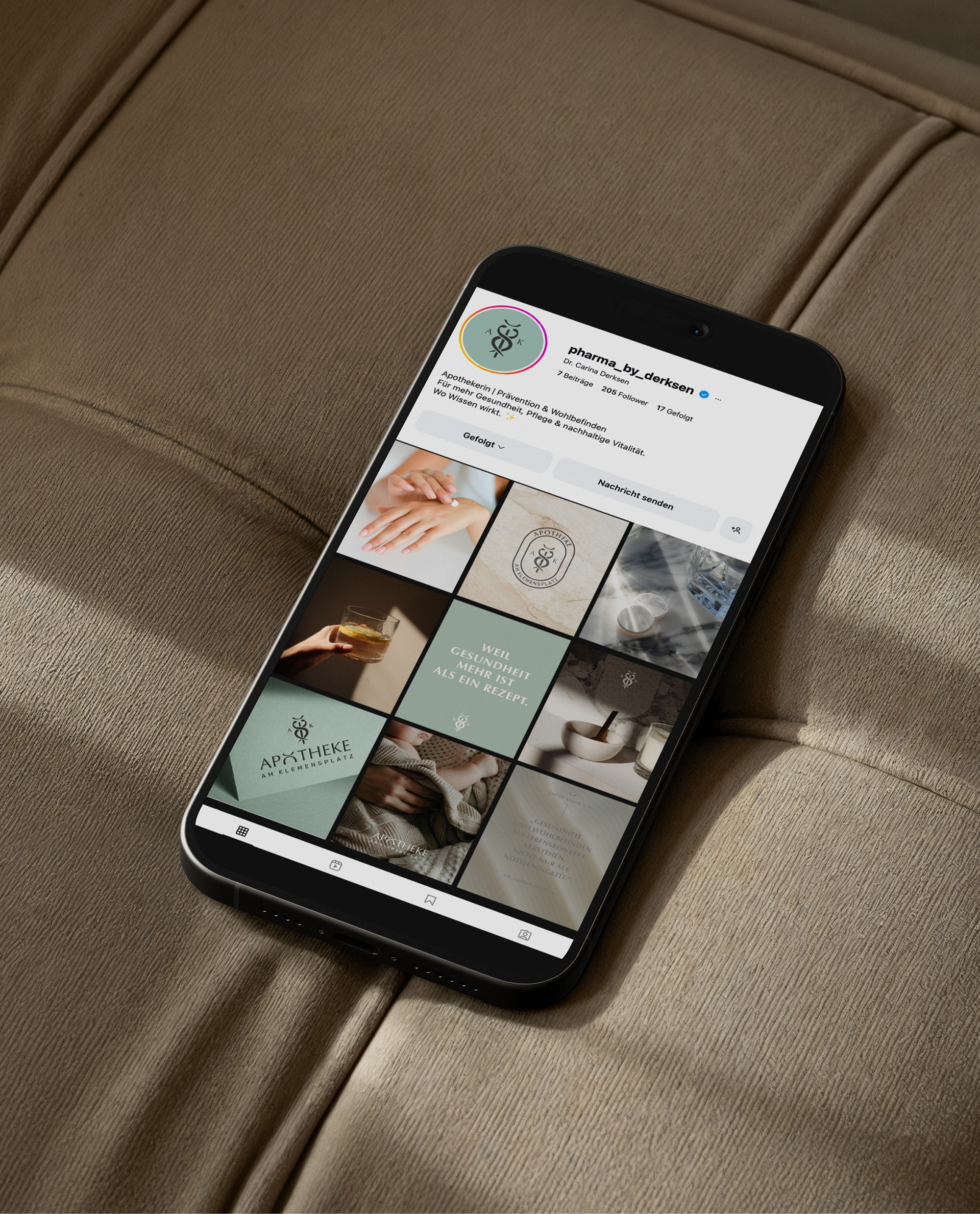 Die Apotheke am Klemensplatz durfte ich für Dr. Carina Derksen gestalten. Carina ist nicht nur Kundin, sondern eine enge Freundin. Ich kenne ihren Weg, ihre Werte, ihre Fragen und ihre Vision. Genau das durfte in dieses Design einfließen.